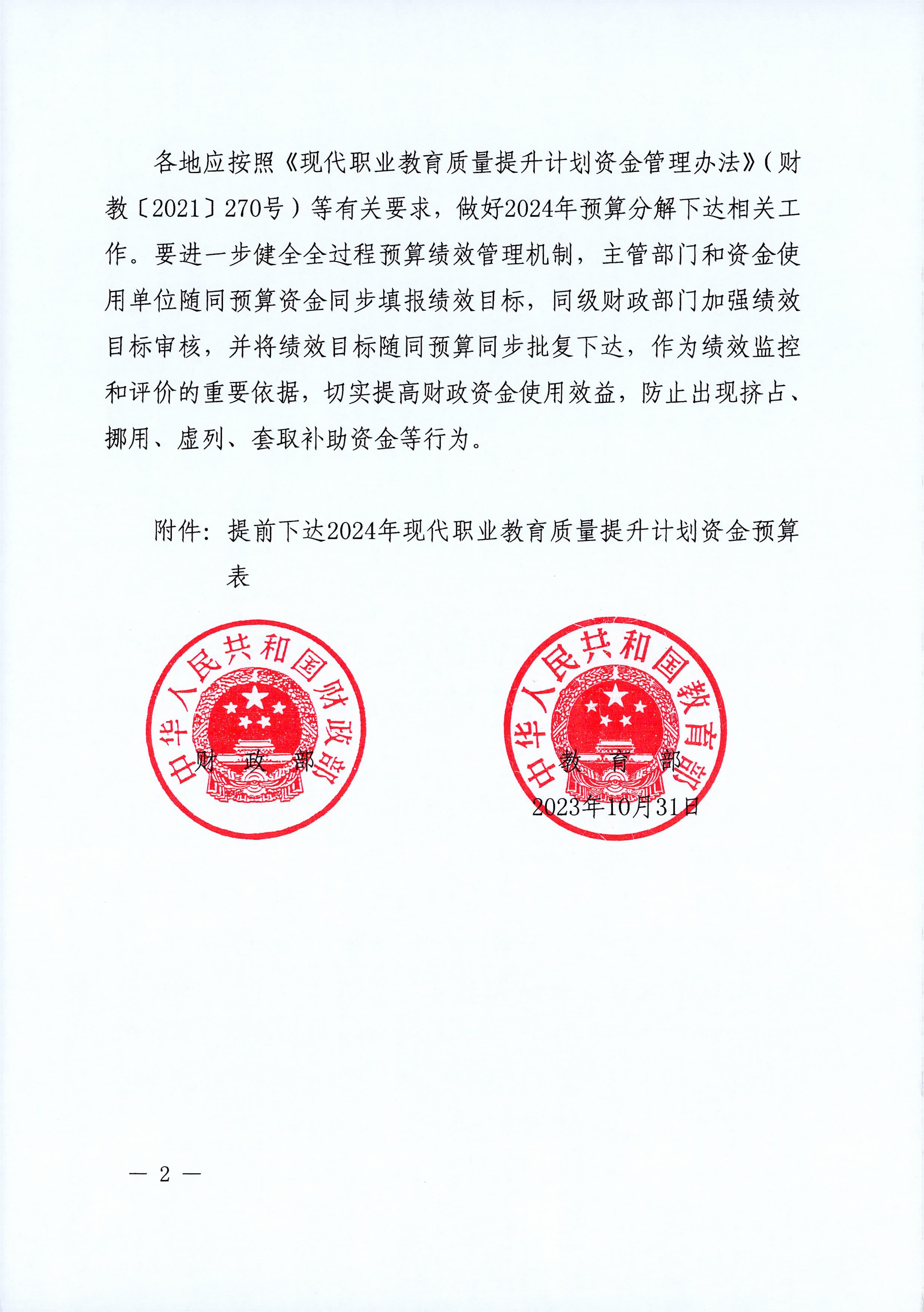 近日,財政部、教育部發(fā)布《提前下達2024年現代職業(yè)教育質(zhì)量提升計劃資金預算的通知》